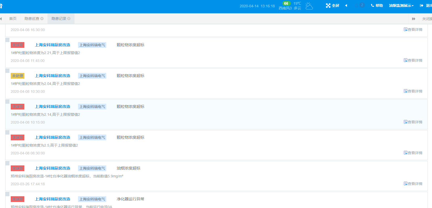 系統根據采集的油煙數值大小,產生對應的排放超標告警;對凈化器的運行數據分析,上傳凈化設備對應的運行、停機、故障等告警事件。