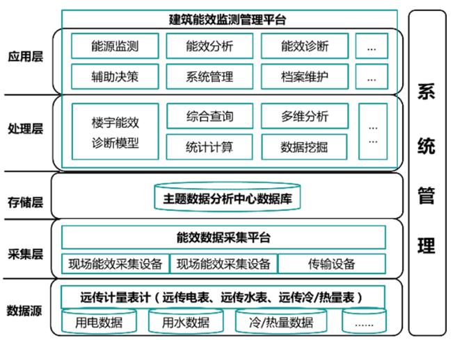 如圖1所示,綜合能耗監(jiān)測系統(tǒng)框架包括功能應(yīng)用層、邏輯處理層、數(shù)據(jù)存儲層、數(shù)據(jù)采集層、數(shù)據(jù)源五層架構(gòu)。其中,功能應(yīng)用層包括能源監(jiān)測、能效分析、能效診斷、輔助決策以及檔案維護(hù)、系統(tǒng)管理等用戶功能,通過多維度、可視化的系統(tǒng)功能界面實現(xiàn)與用戶的信息互動;邏輯處理層通過建立能耗評估模型,并利用數(shù)據(jù)挖掘、統(tǒng)計計算、多維分析等手段對能耗數(shù)據(jù)進(jìn)行分析,為功能應(yīng)用層提供直接的數(shù)據(jù)支持;數(shù)據(jù)存儲層利用主流結(jié)構(gòu)化數(shù)據(jù)庫對能耗數(shù)據(jù)進(jìn)行分類存儲,提高邏輯處理層的處理性能;數(shù)據(jù)采集層利用終端采集設(shè)備實現(xiàn)對智能電表、智能水表和智能冷熱計量表等遠(yuǎn)傳終端的數(shù)據(jù)源采集,為整個綜合能耗監(jiān)測系統(tǒng)提供基礎(chǔ)數(shù)據(jù)支撐。