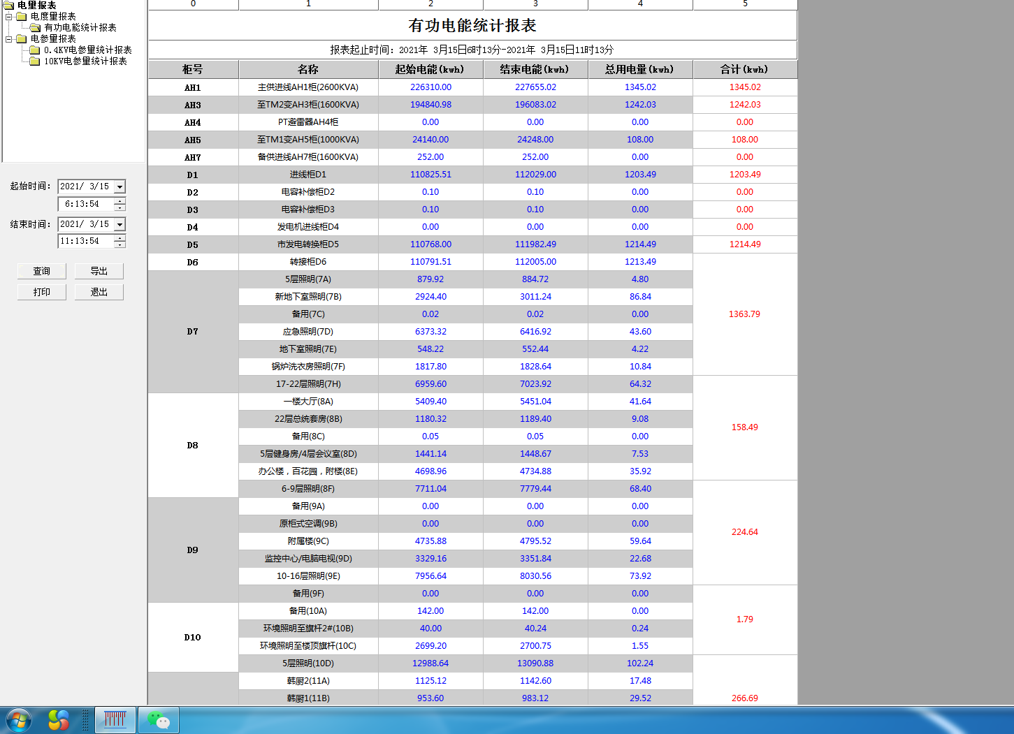 累計查詢,具備數據導出和報表打印等功能。為值班人員提供了精確可靠的電能報表。該報表各回路名稱和數據庫關聯,方便用戶修改回路名稱。如下圖所示,用戶可以直接打印報表,可以以