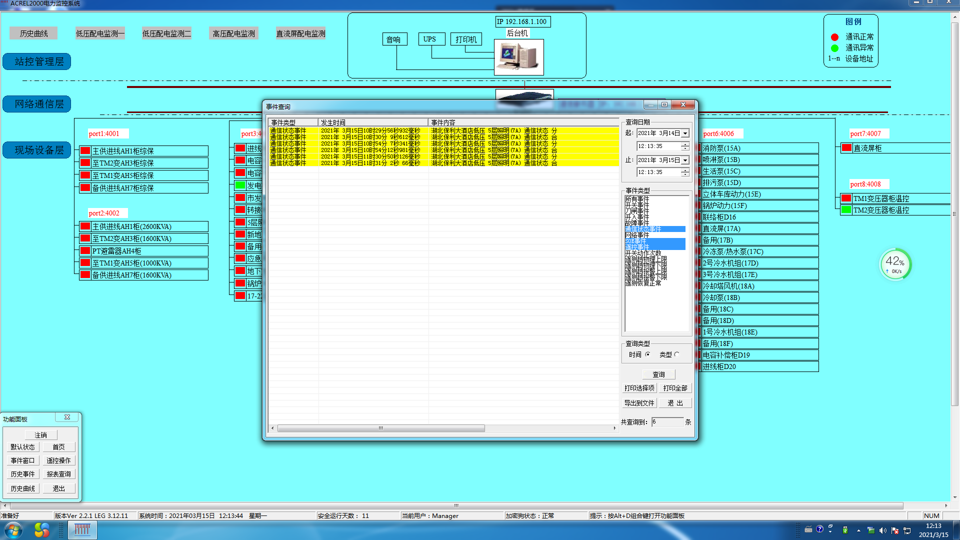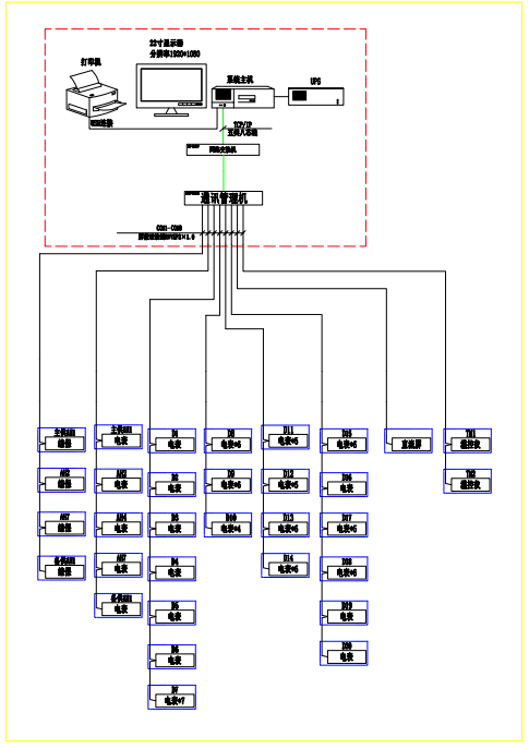 顯示系統的組網結構,系統采用分層分布式結構,同時監測間隔層設備的通信狀態。紅色表示通訊正常,綠色表示通訊故障。
