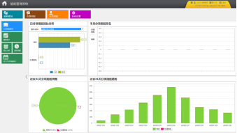 系統可以按照分項進行能耗統計與顯示。其中,日分項用能同比分析圖顯示不同分項的當日與昨日能耗柱狀圖(藍色柱表示今日,綠色柱表示昨日);用能餅圖顯示各分項過去31天的用能占比;堆積圖顯示各分項過去31天的能耗趨勢;分項用能排名圖顯示被選中分項對應能耗值排名前10位的支路。